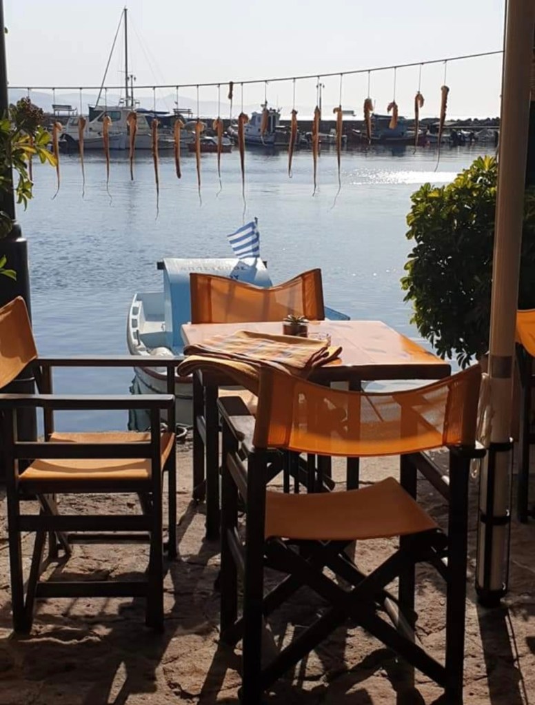 the restaurant owners are smiling and doing everything to serve us well .In the evening Greek music is beginning to play and the tourists are coming along to the port to have their dinner with its fish , its meze , its seafood , its dolmadaki , its Greek salad ,Greek cheese and local desserts.
